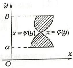 \[S = \int_{\alpha}^{\beta} |\varphi(y) - \psi(y)| dy,\]其中,曲线 \(x = \varphi(y)\) 与 \(x = \psi(y)\) 在区间 \([\alpha,\beta]\) 上可以有有限个交点(如图3.5)。