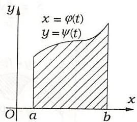(1)当曲边梯形的曲边 \(y = f(x)(f(x)\geqslant 0,x\in [a,b])\) 由参数方程 \(\left\{ \begin{array}{l}x = \varphi(t),\\ y = \psi(t) \end{array} \right.\) 给出时,若 \(x = \varphi(t)\) 适合:\(\varphi(\alpha) = a\),\(\varphi(\beta) = b,\varphi(t)\) 在 \([\alpha,\beta]\)(或 \([\beta,\alpha]\))上有连续导数且 \(\varphi^{\prime}(t)\) 不变号,\(\psi(t)\geqslant 0\) 连续,则曲边梯形的面积为(如图3.9)