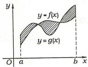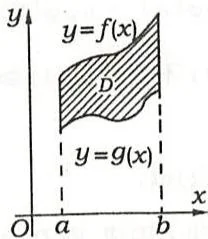 \[S = \iint_{D} \mathrm{d}x\mathrm{d}y = \int_{a}^{b} \mathrm{d}x \int_{g(x)}^{f(x)} \mathrm{d}y = \int_{a}^{b} [f(x) - g(x)] \mathrm{d}x.\]