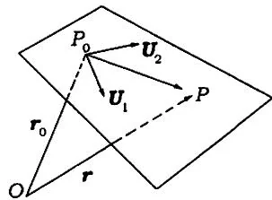 (3)过点 \(P_{0}\),与 \(\boldsymbol{U}_{1}, \boldsymbol{U}_{2}\)(\(\boldsymbol{U}_{1}, \boldsymbol{U}_{2}\) 不平行)都平行的平面的向量方程是 \(\boldsymbol{r} - \boldsymbol{r}_{0} = t_{1}\boldsymbol{U}_{1} + t_{2}\boldsymbol{U}_{2}\)(见图7.2)。