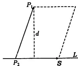 \(\boldsymbol{U}_{2}, \overrightarrow{P_{1}P_{2}}\) 为棱构造平行六面体,则底面 \(\boldsymbol{U}_{1}, \boldsymbol{U}_{2}\) 上的高就是公垂线 \(\overline{PQ}\) 的长,记为 \(d\),且