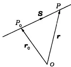 (2)过点 \(P_{0}\),方向向量为 \(\boldsymbol{S}\) 的直线的向量方程是 \(\boldsymbol{r} - \boldsymbol{r}_{0} = t\boldsymbol{S}\)(见图7.1)。