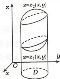 (1)设 \(z = z_{1}(x,y)\),\(z = z_{2}(x,y)\) 在有界闭区域 \(D\) 上连续,\(z_{1}(x,y)\leqslant z_{2}(x,y)\)。\(\Omega\) 是由曲面 \(z = z_{1}(x,y),z = z_{2}(x,y)\) 及以 \(D\) 的边界为准线,母线平行于 \(z\) 轴的柱面所围成的空间区域(可称为柱形长条区域,如图9.34),则 \(\varOmega\) 的体积为